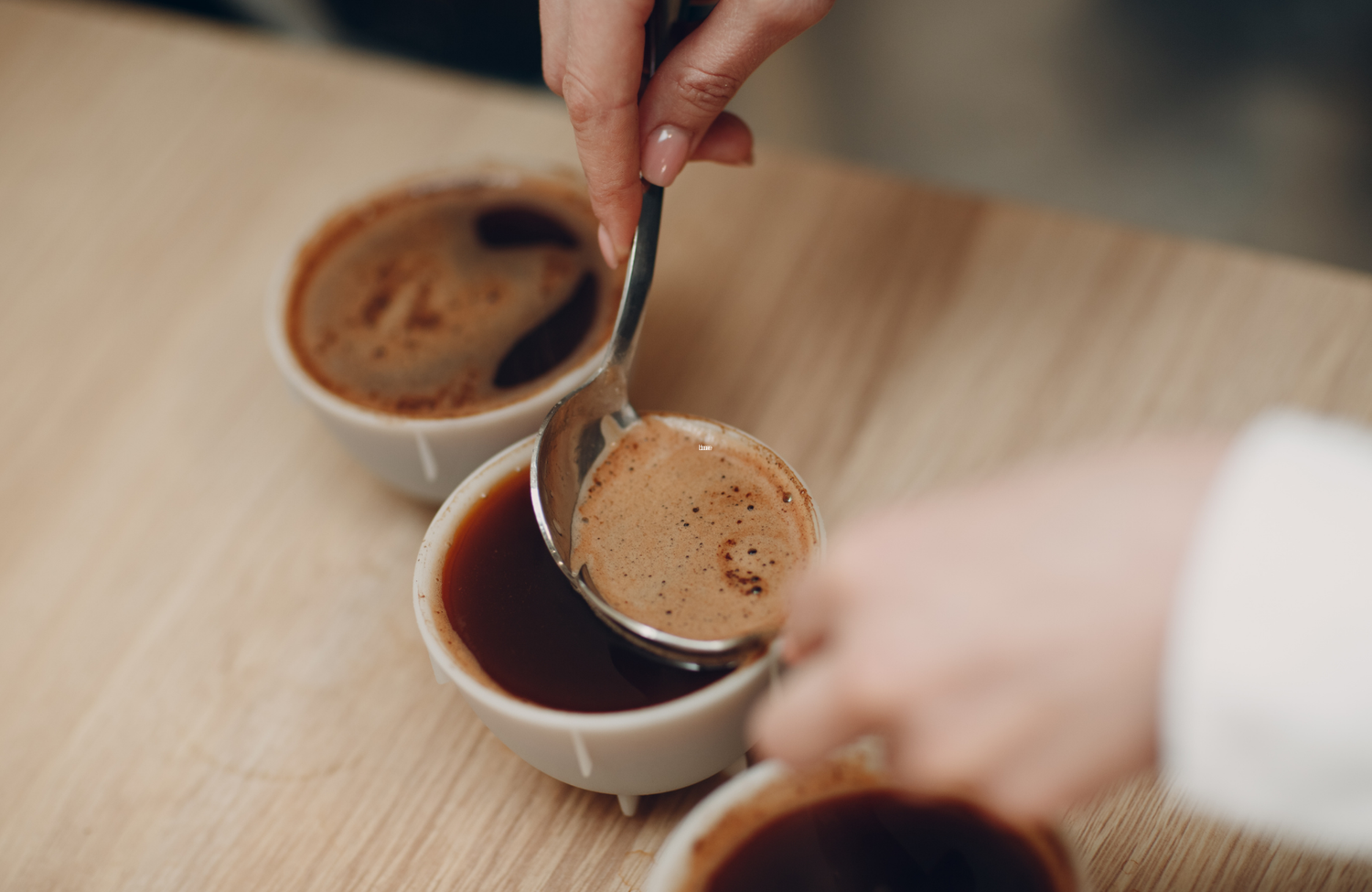Na het ontvangen van de groene koffie branden we eerst een aantal samples waarna we de koffie zorgvuldig gaan cuppen: koffie cuppen is het proeven en beoordelen van koffie op smaak, geur en kwaliteit volgens een gestandaardiseerde methode. Hieruit volgen meestal bepaalde aanpassingen die we doen tijdens het brandproces tot de smaak optimaal is, het aanpassen van de ''development time'' bijvoorbeeld of de eindtemperatuur van de koffiebonen: een verschil van 1 á 2 graden kan je al proeven in de koffiesmaak.