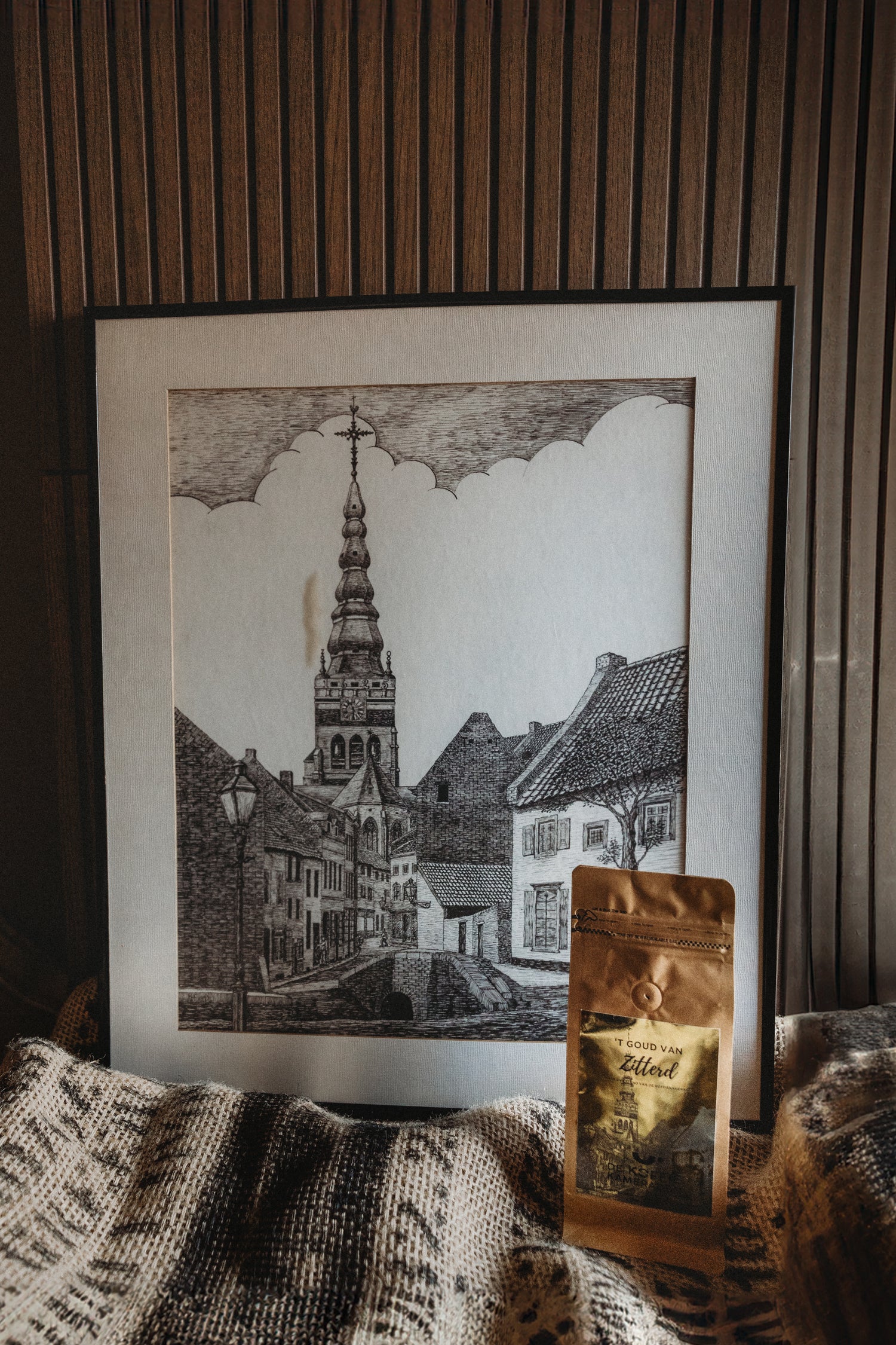 ''‘t Goud van Zitterd is een ontwerp vol herinnering, geïnspireerd op het schilderij dat altijd bij oma in de woonkamer hing. Eén detail maakt het uniek: de koffievlek links naast de kerktoren die oma ooit gemorst heeft. In plaats van schoonmaken, lachten we erom. Hoe leuk is het dat dit schilderij, met een koffievlekje, nu als ontwerp voor een koffiezak mag dienen!''
